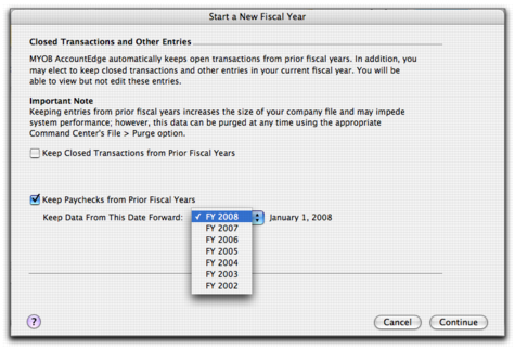 Prior year reporting of payroll informationWhen you start a new fiscal year, you can now select an option to retain paycheck information from prior years.In the Closed Transactions and Other Entries window of the Start a New Fiscal Year Assistant, select the Keep Paychecks from Prior Fiscal Years option and then select the fiscal year from when you want to keep paychecks in your company file. For example, if you’re closing the 2008 fiscal year, and you want to retain all paycheck data for that year, select FY 2008.After you have saved paycheck details from a fiscal year, you can view payroll reports containing information for the saved periods.If you want to purge paychecks at a later date, you can do this when you purge journal entries at the end of a period or as part of your company file maintenance. In the Purge Journal Entries window, deselect the Keep Paychecks option and purge journal entries as you normally would.note : Show Me How movieIf you want, you can view a movie demonstrating this feature. Go to the Help menu and choose What’s New in this Release, then New Feature Movies.When you start a new fiscal year, you can now select an option to keep prior year paycheck information. This option also enables you to view saved payroll details in the following reports: