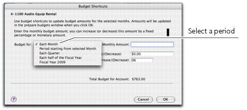 Budget Shortcuts window. You can use this window to enter quarterly, half-yearly and yearly budgets. You can also enter a budget that increases or decreases by a specific amount every month.