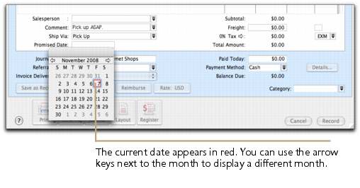 Calendar (date entry)The calendar simplifies date entry. For example, suppose you’re entering a sale and have promised the goods to the customer on the last Friday of the month. Rather than figure out the date and enter it manually, display the calendar in the Promised Date field and click the date.To display the calendar, put the cursor in a date field and press either = (equals) or the Spacebar on your keyboard. Select a date by clicking it, or by using the arrow keys on your keyboard and then pressing . The selected date appears in the date field.