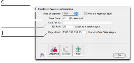 • Equals x Dollars per results in the maximum expense being a fixed dollar amount per pay period, per month, or per year. For example, an expense might be 5% of an employee’s gross wages up to $1,000 per year. If you are creating an SUI or SDI expense, type or select a state postal abbreviation for the employer expense. If you are creating an SUI or SDI expense type, enter your company's state tax identification number in the State Tax ID field. If you are creating an SUI expense type, enter your company's state unemployment insurance (SUI) rate as a percentage.If you are creating an SDI expense type, enter your company's state disability insurance (SDI) rate as a percentage.