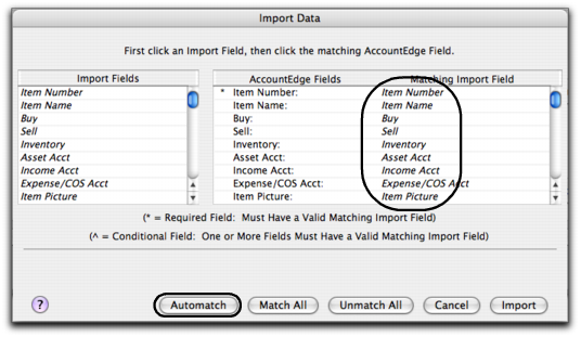 The following changes have been made to the import and export functions in your software.When you import records, you can now automatically match imported data fields to fields in your software.In the Import Data window, click Automatch. The import field names that exactly match the AccountEdge fields are automatically matched in the Matching Import Field column.If there are any fields that remain unmatched, you can match them manually. To reset the window, click Unmatch All.We have enhanced our Applescript dictionary to allow users and developers to gain access to additional areas inside to make moving transactions and other data into and out of AccountEdge easier.