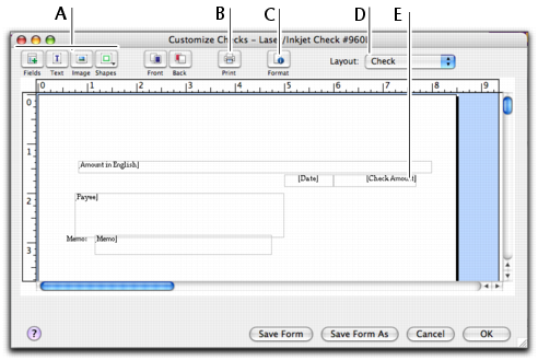 Click an icon to add data, text, image, and shape elements. Click to preview and print your form. Select the required layout for a cheque stub. (Cheque forms only.) Data fields contain system-generated information.note : Cheques have two partsA cheque form has two parts: the cheque itself and the stub. You customize the cheque and the stub separately. In the cheque Customize window, select the appropriate stub layout in the Layout field. For example, the Regular layout is assigned to cheques recorded in the Spend Money window and the Payable layout is assigned to cheques recorded in the Pay Bills window.