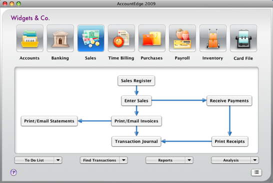 There are eight command centres in your accounting software. The following is an illustration of the Sales command centre.Each command centre contains a row of icons in the top section of the window. These icons allow you to switch between command centres.The selected icon represents the current command centre, and the flowchart displayed below the icons illustrates the major tasks associated with that command centre. (For example, when the Sales icon is selected, tasks such as Enter Sales and Print/Email Statements—typical tasks you would complete in relation to sales—appear in the command centre’s flowchart.)There are four menus at the bottom of each command centre. The options available from these menus are described below.