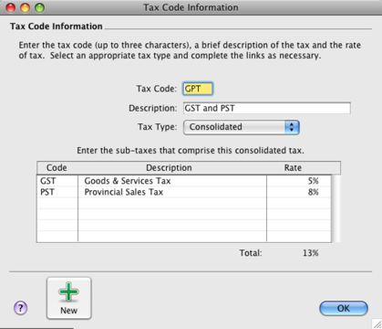 This tax type is used for taxes that are made up of two or more tax codes or sub-taxes. You would use this code if, for example, the 8% tax rate you record on sales is the combined total of a 5% provincial sales tax rate and a 3% goods & services sales tax rate. For more information see below. This tax type should be used by importers bringing goods into the United States from other countries. Tax codes with this type are used to record the import duty payable on a purchase without changing the total amount of the purchase. This tax type is associated with the tax recorded on sales and purchases of goods and services. This tax type (GST) is associated with the tax recorded on sales and purchases of goods and services. It is also associated with the Harmonized Sales Tax (HST) applied in the provinces of Newfoundland and Labrador, Nova Scotia and New Brunswick. This tax type (QST) is associated with the tax recorded on sales and purchases of most goods and services. Using the QST Sales Tax type will accrue PST paid and will include GST when calculating sales tax. In order to include GST, a Quebec Sales tax type tax code must be included with a GST Sales tax type tax code on a Consolidated Tax type tax code.Consolidated tax codesYou can create consolidated tax codes by combining two or more tax codes. For example, the GPT tax code (with an 13% tax rate) is composed of GST (Goods & Services Sales Tax) at 5%, PST (Provincial Sales Tax) at 8%.note : You can only consolidate tax codes that are in your tax code listMake sure you first create the tax codes you want to consolidate. The rest of the fields are filled in for you and the consolidated tax rate is calculated automatically.