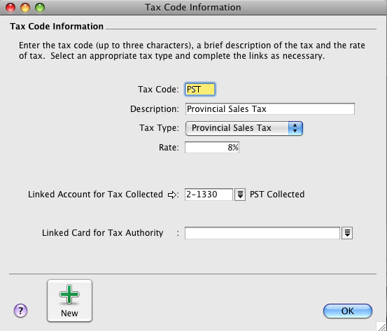 5 Click OK when you have finished. The new tax code you created will now appear in your tax codes list.If a tax rate changes or if you wish to link a tax code to a different account, you can change the tax code information.