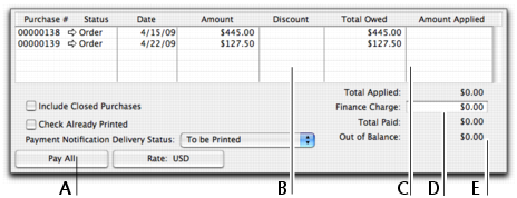 If you are settling your account in full, click Pay All. The total payment amount appears in the Amount field and the individual payment amounts are applied to each open purchase. If you take an early-payment discount for a purchase, assign the discount to the appropriate bill in this column. Note that the software will not allow you to assign a discount to a bill that you are not settling in full. If this is the case and you want to record a discount that the vendor has given you, you can create a vendor debit. See Recording and settling vendor debits. Amount Applied Type how much of the payment you want to apply to each bill in this column. Finance Charge If part of the payment was used to pay finance charges, type the finance charge amount here. Out of Balance The amount you apply in the Amount Applied column will accumulate in the Total Applied field. The Total Paid amount must equal the amount that appears in the Amount field in the top half of the window before you can record the transaction. The Out of Balance amount must be zero before you can record the transaction.