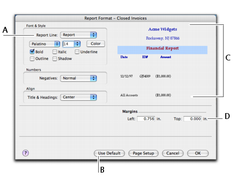 From the Report Line list, select the section of the report you want to customize and then change the formats as required. If you have formatted a report and want to change it back to its original format, click Use Default. The right side of the Report Format window shows a preview of each report section.