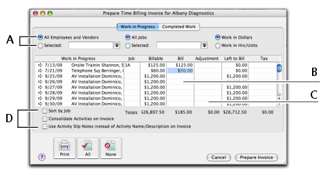 ■ In the Sales window. Use this method if you don’t need to record details of activities and activity slips or track work in progress.To create a time billing invoice using the Prepare Time Billing Invoice windowThe Prepare Time Billing Invoice window allows you to enter and adjust the billing information for activity slips. As you make changes in the Prepare Time Billing Invoice window, your activity slip records are updated automatically.