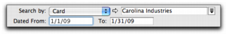 3 Filter your search using the Search by and date range fields. For example, to search for all transactions made on October 10th, 2008, relating to Carolina Industries, you would make the following selections in the Card view.