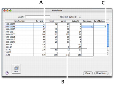 The On Hand column shows the total quantity available in your inventory across all locations. Type the quantity held at each location. Increase the quantity for locations receiving items and reduce the quantity for locations where items are moved from. The value in the Out of Balance field must be zero before you can record the movement. That is, the amount in the On Hand column for the item must be equal to the sum of the amounts in your location columns.