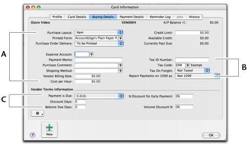 Buying information The selections you make here will be used, by default, on quotes, orders, and bills that you create for this vendor. You can override these selections when recording the purchase. Tax information Enter the vendor’s tax information here. If you are creating a card for a 1099 vendor, see Entering employee payroll information. The credit terms you entered earlier appear here by default. You can override them here for this vendor. The credit terms entered here are used as the default terms for all purchases from the vendor, but can be changed at any time.