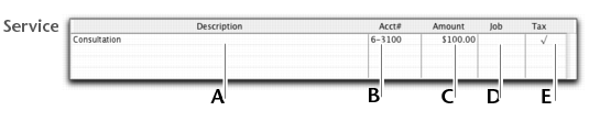 This field is display-only. It displays the quantity of items received. For more information, see Receiving items without a bill. Type the quantity of the item to be placed on backorder. An order for this amount will be created automatically when you click Record. Item Number Press tab and select an item from your item list. A description of the item appears automatically. You can change this if you want. If you store this item in multiple locations, select the location where the item will be received. For more information about locations, see Inventory locations. If you have purchased the item before or you have entered a standard cost in the Buying Details tab of the Item Information window, the price of the item appears automatically. You can change this if you want. [Optional] Select a job number here to assign a line item to a specific job. For more details, see Jobs. If the item is taxable, click the Tax column.The following illustration shows the fields for purchase with a Service layout and a Bill status. These fields also apply to the Professional and Miscellaneous layout.
