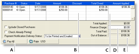 If you are settling your account in full, click Pay All. The total payment amount appears in the Amount field and the individual payment amounts are applied to each open purchase.