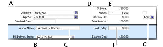 The fields that appear at the bottom of the Purchases window differ, depending on the type of purchase you are creating.