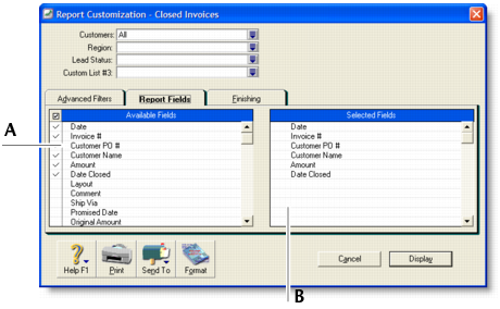 Fields in the Selected Fields column are set to be printed on the selected report. From the top down, the sequence of fields in this column is in the order the fields will appear in the report. The first field will appear as the left most column of the report, the second field will appear in the next column to the right, and so on.