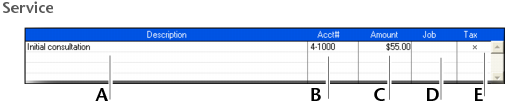 The following illustration shows the line item entries for a sale with a Service layout and an Invoice status. These fields also appear in the Professional and Miscellaneous layouts.