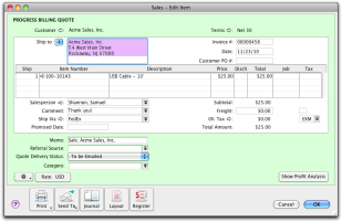 Progress Billing enables you to create an invoice from a quote by billing your customer for a percentage of the original quote or a quantity, rate, or amount for each line item.