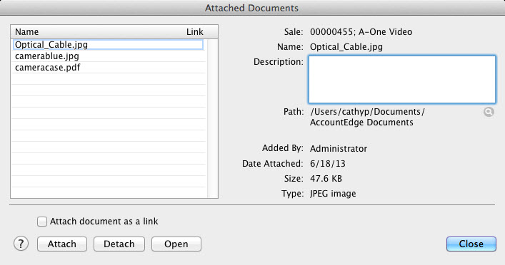 When using an attachment, you can either link directly to the original source file or have AccountEdge create a copy of the document and file it along with other attachments in a new AccountEdge documents folder.