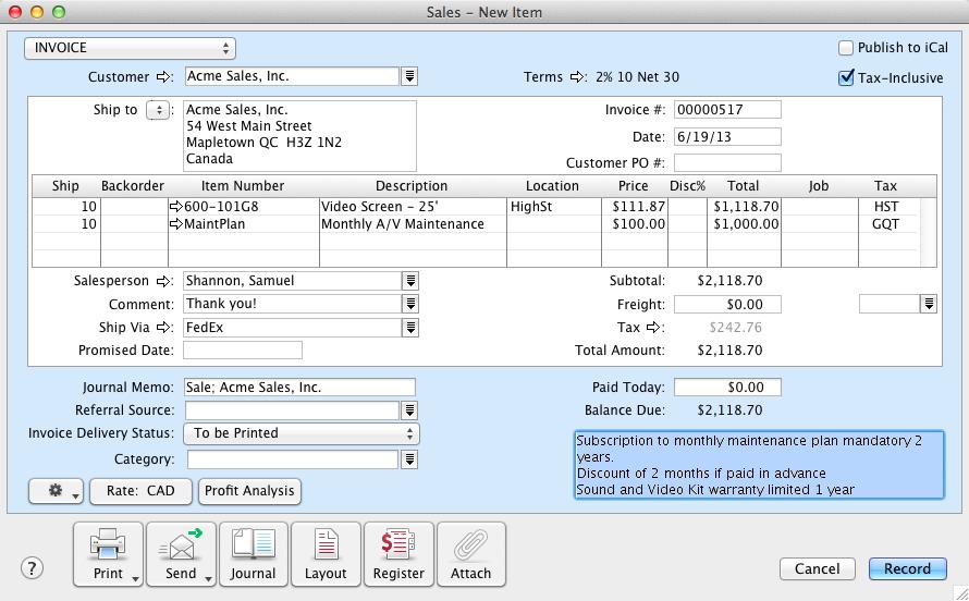 You can now add a note to your sales and purchases. For example, if a sales person needs to add notes to a quote, order or invoice for use with a contract or for warranty details they can easily add the notes directly to the quote, order, invoice or bill.