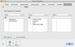 From the Item Information window - Variations view, of the master item, click the Select.. menu to select the property. Only 1 property can be selected for each list. Once you have selected a property a list of details will appear. Any or all details can be selected. You can select up to 3 properties for each master item.