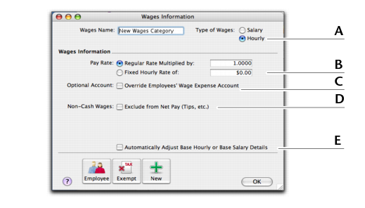 If you select Hourly as the type of wages, the Pay Rate fields appear. Select Regular Rate Multiplied by and enter, for example, 2 for double time or 1.5 for time and a half. This will multiply the employee’s Hourly Base Pay (entered in the Payroll Details tab view of their card) by this amount. Alternatively, you can enter a fixed hourly rate. This dollar amount per hour will be the same for each employee regardless of their hourly base pay.