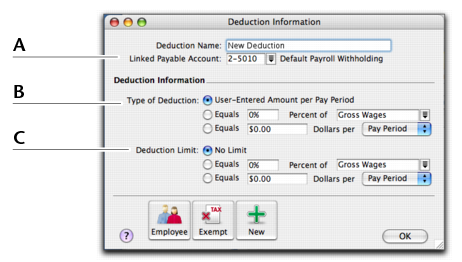 Linked Payable Account is the account (usually a liability account) in which all the deducted money will be accrued. The Default Withholding Payable Account you specified when setting up payroll appears as the default. You should change this default if you want to track the deduction separately. For example, if you are deducting union fees, create a Union Fees Payable liability account. This way, the balance sheet will display the deductions separately from your taxes and other deductions.