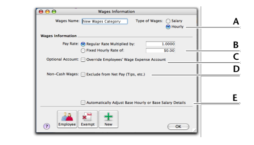 If you select Hourly as the type of wages, the Pay Rate fields appear. Select Regular Rate Multiplied by and enter, for example, 2 for double time or 1.5 for time and a half. This will multiply the employee’s Hourly Base Pay (entered in the Payroll Details tab view of their card) by this amount. Alternatively, you can enter a fixed hourly rate. This dollar amount per hour will be the same for each employee regardless of their hourly base pay.