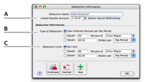 Linked Payable Account is the account (usually a liability account) in which all the deducted money will be accrued. The Default Withholding Payable Account you specified when setting up payroll appears as the default. You should change this default if you want to track the deduction separately. For example, if you are deducting union fees, create a Union Fees Payable liability account. This way, the balance sheet will display the deductions separately from your taxes and other deductions.