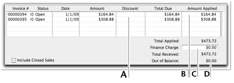 The amount you apply in the Amount Applied column will accumulate in the Total Applied field. The Total Applied amount (plus finance charges) must equal the Amount Received value and the Out of Balance amount must be zero before you can record the transaction.