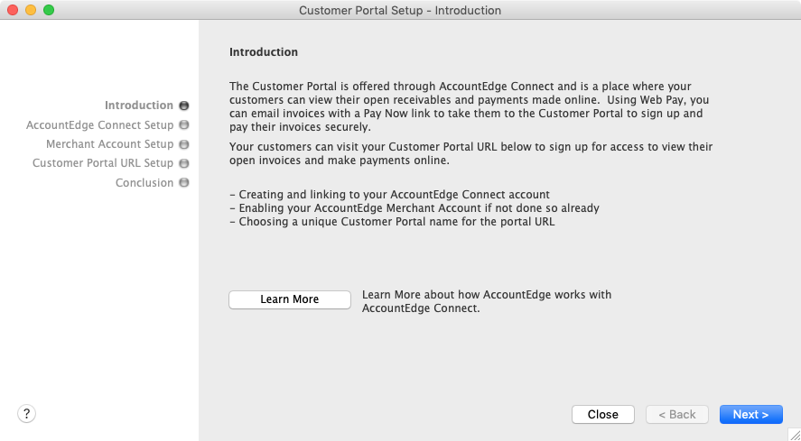 Go to the Setup menu from any command centre and select Customer Portal Setup then select Setup Customer Portal & Web Pay. The Customer Portal Setup assistant appears. Click Learn More for more information on how AccountEdge works with AccountEdge Connect.
