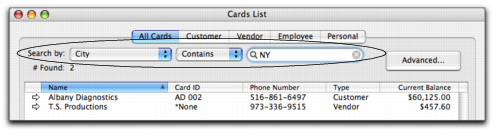 Records are stored and displayed in lists. For example, the Jobs List window lists the jobs you have created, the Accounts List window lists your accounts, and so on. As lists get long, it can take time to locate a record. Use the following tools to quickly find a record.Some lists are divided into separate views using tabs. For instance, the accounts list is divided by account type into eight views (using eight tabs), making it easier for you to find an account. For example, if you are looking for an asset account, click the Assets tab. Within the tab you can use the scroll bar to find the account.You can find a record by filtering cards, activities, locations,jobs, categories, recurring transactions, and items lists using the search fields. To do this, select a filter from the Search by list choose how you want to identify records (Contains or Starts With) and enter search terms in the adjacent field, then press Tab. The list is sorted according to your selections. To reset the list, click the () icon next to the search field.