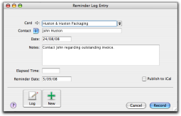 The reminder log enables you to keep a detailed log of all the phone calls you and your contacts make to each other, and any other type of correspondence.