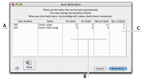 Type the quantity of finished items you want to build in the Qty. to Build column. (Click None if you want to change all numbers in this column to zero.)