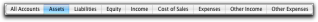 Some lists are divided into separate views using tabs. For instance, the accounts list is divided by account type into nine views (using nine tabs), making it easier for you to find an account. For example, if you are looking for an asset account, click the Assets tab. Within the tab you can use the scroll bar to find the record.