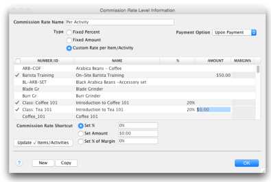 Click OK to accept the changes and close the window. The Commission Rate Levels window reappears displaying the rates you created.