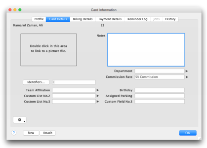 Click the Employee tab and select the employee you want to assign a commission rate to and click Edit or click New to create a new employee card. The Card Information window appears.