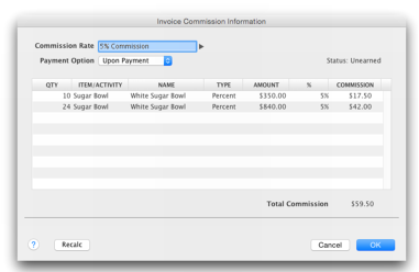 Click the percentage symbol to access the details of the calculated commission. The Invoice Commission Information window appears. The Commission column is the only amount that can be edited in this window. If the amount in this column is changed an asterisk will appear next to the new amount. To return to the original calculation, click the Recalc button.