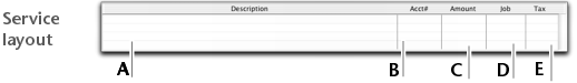 The following illustration shows the fields for a purchase with a Service layout and a Bill status. These fields also apply to the Professional and Miscellaneous layouts.