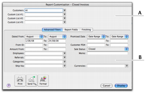 The customisation options that appear depend on the report being customised. The example below shows the options available for the Closed Invoices report (which is one of the Sales reports).