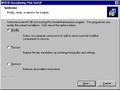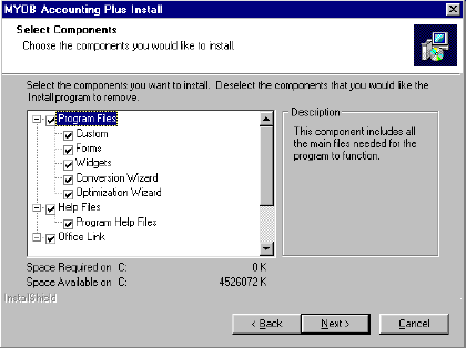 In this window, you can choose individual Accounting Plus components by clicking the box next to each component you want; check marks will appear next to the options you selected when you first installed Accounting Plus. Mark or unmark the files you wish to add or remove from your hard drive.