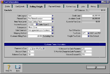 Your entries in the Card Information window will appear as default entries in the Sales and Purchases windows, saving you valuable time. In the past, you needed to make these entries every time you recorded a sale or purchase.