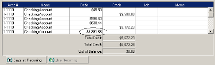 When you've finished entering individual deposits and check/withdrawal amounts, it's unlikely that the debits will equal the credits in the Record Journal Entry window. If there is an out of balance amount, you'll need to enter another line item with an amount that balances the debits and credits.