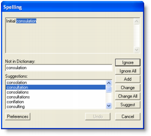 • Description (for Service, Professional, Item, and Miscellaneous layouts) You can choose to set a preference to automatically check spelling or manually check spelling. For more information, see Set spelling preferences.When you choose to automatically check spelling and attempt to record a transaction with a misspelled word, the Spelling window appears.The Spelling window displays the misspelled word and suggests a replacement. You can choose to change the word to the suggested replacement, add it to your dictionary or set the spell-check feature to ignore it.If you want, you can customize your spelling preferences. For example, you can change the main dictionary language and choose a preference to ignore words that include numbers.