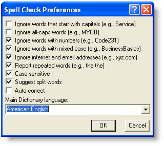 Ignore words that start with capitals Ignore words with initial capitals, such as proper names, place names, company names, and product names. Ignore all-caps words Ignore words entered in capitals, including acronyms (e.g., IRS, MYOB, PC). Ignore words with numbers Ignore combinations of words (or letters) and numbers (e.g., P35, Code231). Ignore words with mixed case Ignore words with a mixture of upper and lower case letters (e.g., BusinessBasics, iMac). Ignore internet and email addresses Ignore combinations of words, letters, numbers, and characters typical of website and email addresses (e.g., www.myob-us.com, customer.service@myob-us.com). Report repeated words Report instances of two or more repeated words (e.g., the the, itit). Check different cases of the same word (e.g., ‘Service’ and ‘service’ are treated as two separate words). Suggest split words Suggest two replacement words for a single joined word (e.g., ‘it is’ for ‘itis’). Automatically replace common misspellings (e.g., ‘teh’ is replaced with ‘the’). Main dictionary language Set the main dictionary language used by the spell-check feature (e.g., British English, American English).note : Show Me How movieIf you want, you can view a movie demonstrating this feature. Go to the Help menu and choose What’s New in this Release, then New Feature Movies.