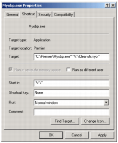 7 In the Target field, type a space after the closing quotation mark (“), and then type the location of the company file, including the .myo file extension.[Windows 2000 and XP users only] The path to this location should also be enclosed in its own quotation marks, for example, "C:\Premier\Myobp.exe" "V:\Clearwtr.myo."