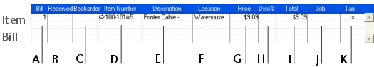 This field is display-only. It displays the quantity of items received. For more information, see Receiving items without a bill. Type the quantity of the item to be placed on backorder. An order for this amount will be created automatically when you click Record. Item Number Press tab and select an item from your item list. A description of the item appears automatically. You can change this if you want. If you want to check spelling in this field, click Spell. For more information, see Spell-check. If you store this item in multiple locations, select the location where the item will be received. For more information about locations, see Inventory locations. If you have purchased the item before or you have entered a standard cost in the Buying Details tab of the Item Information window, the price of the item appears automatically. You can change this if you want. [Optional] Select a job number here to assign a line item to a specific job. For more details, see Jobs. If the item is taxable, click the Tax column.The following illustration shows the fields for purchase with a Service layout and a Bill status. These fields also apply to the Professional and Miscellaneous layout.