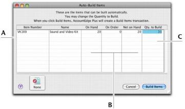 For items that you repeatedly build, you can use the Auto‑Build function to build the finished items.Before you can build a finished item using the Auto-Build function, you need to define what component items are needed to build the item.You can also auto-build items using the To Do List. (In the Stock view of the To Do List, select the items you want to build and click Order/Build.)