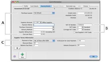 Buying information The selections you make here will be used, by default, on quotes, orders and bills that you create for this supplier. You can override these selections when recording the purchase. VAT information The supplier’s VAT information is entered here. If the supplier’s VAT status takes precedence over that of the item or service being sold, click the Use Supplier’s VAT Code option. See ‘Assigning VAT codes to cards’ on page 196. The credit terms you entered earlier appear here by default. You can override them here for this supplier. The credit terms entered here are used as the default terms for all purchases from the supplier, but can be changed at any time.