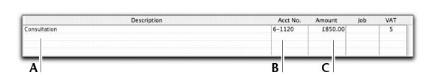 Task 3: Enter the items or services you are purchasingThe scrolling list in the middle of the Purchases window is where you enter details of what you are buying. In this area, you enter item numbers, descriptions, account numbers (or account names, depending on your selection in the Preferences window) and other information about your transaction.One row in the scrolling list is one line item of the transaction. You can enter as many line items for a purchase as you want. The fields that appear in the scrolling list differ according to the type of purchase you are creating.The following illustration shows the fields for a purchase with an Item layout and a Purchase status.