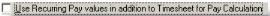 If you want to pay employees from timesheet entries only, deselect the Use Recurring Pay values in addition to Timesheet for Pay Calculation option.